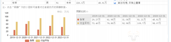 事实上,张军近年来的薪酬都不太稳定,有升有降,且在同行当中也不算多,据东方财富网的数据显示,从2019年到2023年,他的薪酬分别为29.27万、61.95万、31.08万、51.21万和45.61万元。