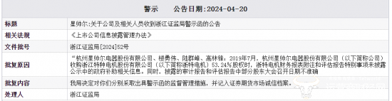 今年4月,星帅尔发公告称,公司于近日收到中国证券监督管理委员会浙江监管局出具的《关于对杭州星帅尔电器股份有限公司及相关人员采取出具警示函措施的决定》([2024]52号)。