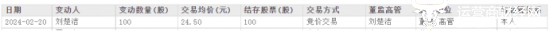 值得注意的是,今年2月,刘楚洁通过“竞价交易”的方式增持公司股票100股,交易均价为24.50元。本次增持后,她的结存股票变为100股。