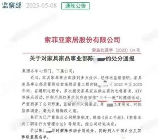 值得注意的是,去年5月8日,索菲亚发布了一则处分通报。该通报中称,公司一高级质量工程师陈某某于2022年至2023年间,在履职过程中,多次接受家具家品供应商的吃喝宴请、KTV等娱乐活动,并利用职权要求供应商安排“三千一晚”的嫖娼活动,严重损害了公司形象。