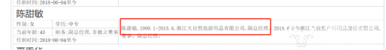 而浙江自然2023年年报披露,“1999.1-2018.6,浙江大自然旅游用品有限公司,副总经理”,这句话的意思不知是否指1999年1月起,陈甜敏担任大自然有限的副总经理,但1999年陈甜敏只有18岁左右。