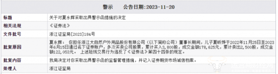 值得注意的是,去年11月,浙江自然董事长夏永辉收到了浙江监管局出具的警示函([2023]184号),并记入证券期货市场诚信档案。