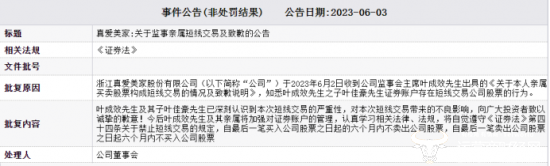 值得注意的是,去年6月,真爱美家发布了《关于监事亲属短线交易及致歉的公告》。该公告中称,真爱美家于2023年6月2日收到公司监事会主席叶成效先生出具的《关于本人亲属买卖股票构成短线交易的情况及致歉说明》,知悉叶成效先生之子叶佳豪先生证券账户存在短线交易公司股票的行为。