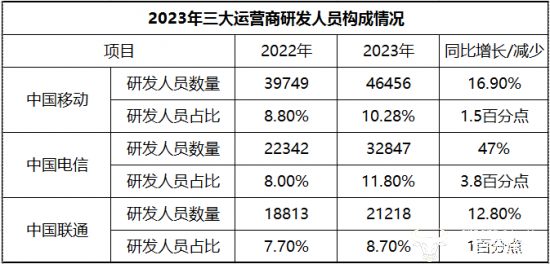 中国电信研发人员达32847人,同比增长47%;研发人员数量占公司总人数的比例达11.8%,较2022年同期增加3.8个百分点。