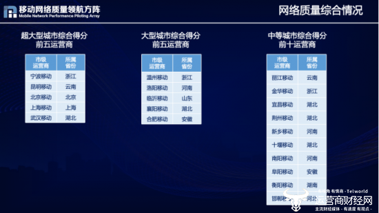 2023年,中国信通院受工信部委托,牵头组织了面向基础电信企业的移动网络质量评测。本次论坛发布了超大、大型城市移动网络质量得分前5名的城市运营商以及中型城市移动网络质量得分前10的城市运营商评测结果,均为中国移动,其中超大城市前5名城市运营商分别为宁波、昆明、北京、上海、武汉移动公司,大型城市前5名分别为温州、洛阳、临沂、襄阳、合肥移动公司,中等城市前10名分别为丽江、金华、宜昌、荆州、新乡、十堰、南阳、阜阳、衡阳、邯郸移动公司。