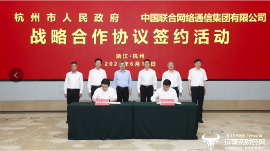 6月11日下午,中国联通与杭州市政府签订战略合作协议。省委副书记、市委书记刘捷,中国联通党组书记、董事长陈忠岳出席签约仪式并讲话。市委副书记、市长姚高员主持,市委常委、秘书长朱华,副市长胥伟华,中国联通党组副书记、董事、总经理简勤,党组成员、副总经理唐永博出席。胥伟华与唐永博代表双方签约。