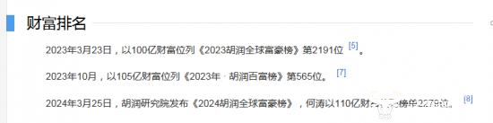 百度百科显示,去年3月,何涛以100亿财富登《2023胡润全球富豪榜》,10月以105亿财富登百富榜;今年3月,他的身价财富又被指高达100亿元。不过,这个估值是否准确以及有何依据,则不清楚。