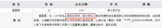 雷霓霁是飞乐音响现任高管中唯一的女性,她出生于1977年,今年47岁。公开信息披露她为“研究生学历,硕士学位”,但未说明其具体毕业院校、专业及是否为全日制学历。
