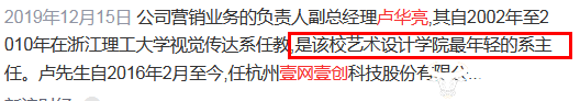 大学毕业后,卢华亮留校在艺术设计学院视觉传达系任教,这一干就是八年。网上甚至有媒体报道他是该校艺术设计学院最年轻的系主任,此事不知真假,上市公司资料中也并未披露他当过系主任,假如属实的话,一个本科毕业生留校不但能教学,还当上了系主任,这似乎不简单。