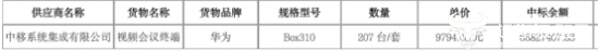 项目进展很快,根据中标结果,中移系统集成有限公司成功拿下项目,值得注意的是,此次中移系统集成公司中标金额为66827407.83元,给出了约4.71折的报价,与总预算相差约7498.5万元。中移系统集成公司这次可谓是“下了血本”。其中,视频会议终端设备均为华为品牌。
