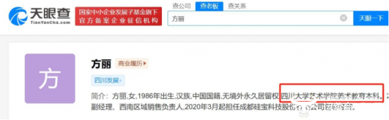 方丽出生于1986年,今年38岁。据天眼查高管资料显示,她是四川大学艺术学院美术教育本科在读,不知是否为成人教育本科?那她的第一学历是什么,尚未公布。