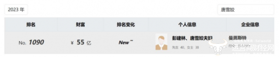 企业成功上市,唐雪姣与彭建林的身价自然也水涨船高,据2023年胡润百富榜显示,夫妻二人以55亿的身价首次登上百富榜,排名1090位,而今年两人都不过40岁,可以说是年轻有为。
