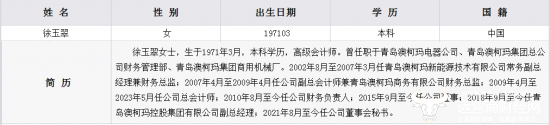 从2002年8月起,徐玉翠在青岛澳柯玛新能源技术有限公司担任要职,任其常务副总经理兼财务总监。