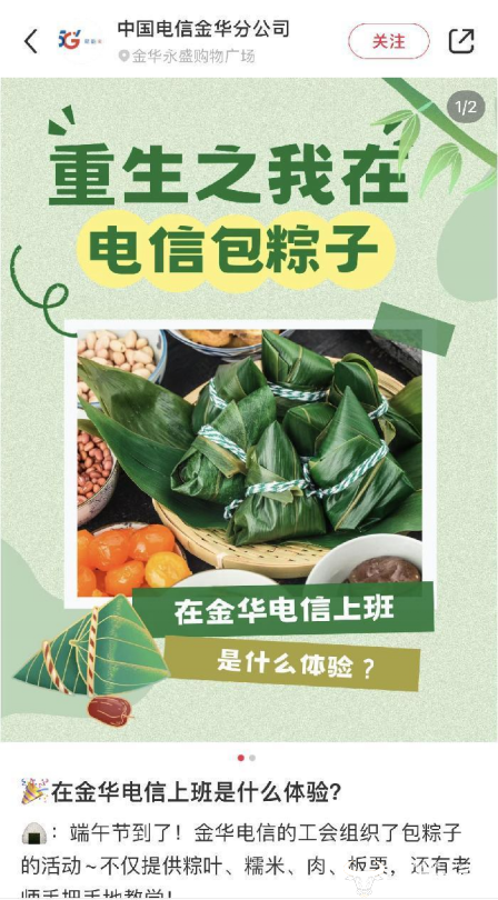 不过,也有的运营商公司在端午前搞了小活动。中国电信金华分公司官方账号披露,金华电信的工会组织了包粽子的活动。除了给员工们提供粽叶、糯米、肉、板栗,还请了老师手把手进行教学。