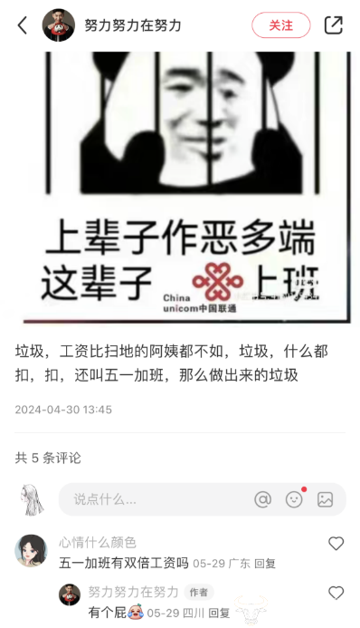 运营商财经网浏览网友主页发现,该网友就职于联通,还曾抱怨工资低,称:比扫地阿姨都不如,垃圾,什么都扣,扣,还叫五一加班。据网友透露,五一加班期间没有加班费。网友配图上的文字是:上辈子作恶多端,这辈子中国联通上班。