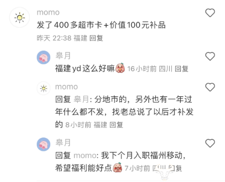在该网友评论区,有账号IP显示在福建的网友透露,自己公司发了400多超市卡+价值100元补品。不过该网友也表明,分地市的,另外也有一年过年什么都不发,找老总说了以后才补发的。暂时并不清楚该网友就职于哪个运营商。