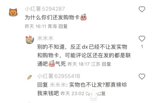 值得一提的是,评论区还有IP在江苏的网友表示:反正dx(代指电信?)已经不让发实物和购物卡,可能评论区还在发的都是联通吧。