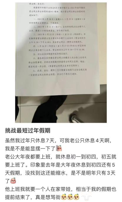 同时运营商财经网也注意到,就职于江苏某联通的这名网友还透露,去年过年只休息7天。但是网友老公更惨一些,就职于常州某银行,去年过年只休息了4天。