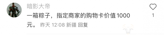 IP定位在新疆的网友透露,300购物券,自己选择买点啥;还有同一地区的网友透露自己的端午福利是:一箱粽子,指定商家的购物卡价值1000元。