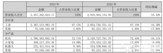 分产品来看,爱仕达炊具产品营收约17.87亿元,同比下降16.11%;小家电产品约3.68亿元,同比下降0.6%;机器人产品营收约2.32亿元,同比下降34.44%。