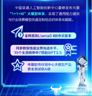 作为中国联通创新能力体系的重要组成部分,中国联通人工智能创新中心主要负责中国联通人工智能顶层方案设计,聚焦大模型研发攻关,探索潜在颠覆性技术,梳理人工智能发展关键环节,整合资源加速一体化能力聚合,对内赋能生产场景应用,对外提供人工智能产品和运营服务,赋能经济社会高质量发展,是中国联通布局战略性新兴产业、打造新质生产力,开启第二增长曲线的重要力量。近期重磅发布元景“1+1+M”大模型,实现了通用能力提供与行业场景模型快速定制结合的体系化赋能。