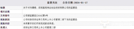 今年1月,深圳证券交易所上市公司管理二部向刘潭爱、深圳高视伟业创业投资有限公司发出监管函(公司部监管函[2024]第9号)。