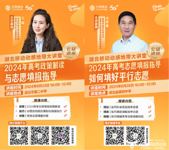 为解答考生和家长的疑虑,提供个性化志愿填报建议,湖北移动将举办两场动感地带大讲堂高招专题公益讲座,6月23日特邀华中科技大学本科生院招办王颖老师解读高考政策,6月26日特邀原湖北省招办副主任潘香春老师讲解填报平行志愿相关内容。广大考生和学子可通过中国移动动感地带视频号、抖音号,湖北移动视频号,观看直播、参与互动答疑。