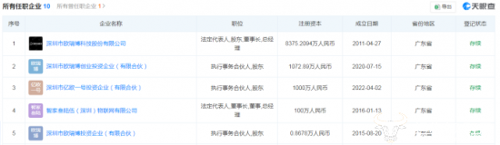 天眼查显示,王雄辉目前是欧瑞博的实控人、董事长、总经理,并兼任多职。如在智家叁陆伍(深圳)物联网有限公司担任董事长、总经理,在深圳市欧瑞博创业投资企业(有限合伙)担任执行事务合伙人、股东等。