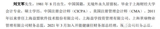 刘文军出生于1981年8月,今年43岁。开能健康2023年年报披露他“毕业于上海财经大学会计专业,硕士学历”。另外,还拥有中国注册会计师(CICPA)、美国注册管理会计师(CMA)职称。