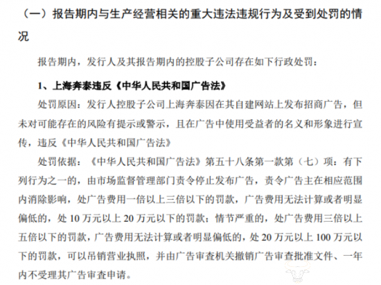 因此,2020年7月23日上海奔泰受到上海市浦东新区市场监督管理局10万元罚款处罚。当事人积极配合市场监管部门调查,如实陈述违法事实并主动提供证据材料,且违法时间较短。该行政处罚不构成重大违法违规行为。