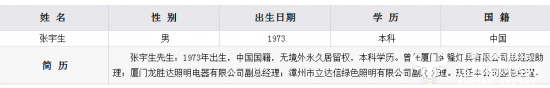 他在照明行业有较长时间的从业经历,曾在多家公司担任要职。如在厦门金隆灯具有限公司,担任总经理助理;在厦门龙胜达照明电器有限公司,担任副总经理;在漳州市立达信绿色照明有限公司,担任副总经理等。