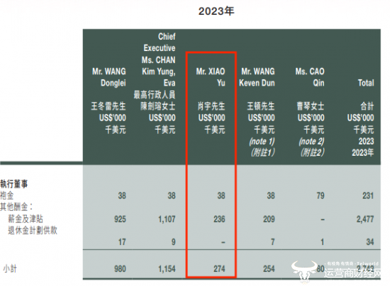 同年4年24月,雷士国际“二零二三年报”发布,执行董事肖宇薪酬为27.4万美元。其中包括袍金3.8万美元,薪金及津贴23.6万美元。