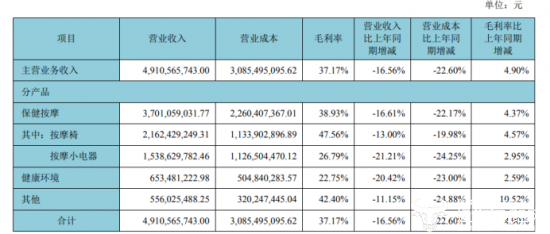 2023年度,公司主营业务收入约为49.11亿元,同比下降16.56%。分产品看,按摩椅营收约21.62亿元,同比下降13%;按摩小电器营收约15.39亿元,同比下降21.21%;健康环境营收约6.53亿元,同比下降20.42%。