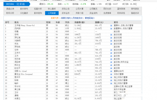 其中,董事长王传福薪酬增长了46.3万元(从614.7万元提高到661万元);副总裁王杰薪酬增长了43.7万元(从370.4万元提高到414万元);副董事长吕向阳是副总及以上高管中薪酬涨幅最低的,只涨了3万元(从20万元提高到23万元)。