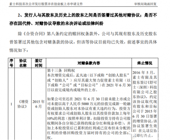 而除了这份对赌协议之外,素士科技与其现有股东及历史股东 还曾签署过其他包含对赌条款的协议,但该等协议目前均已失效。