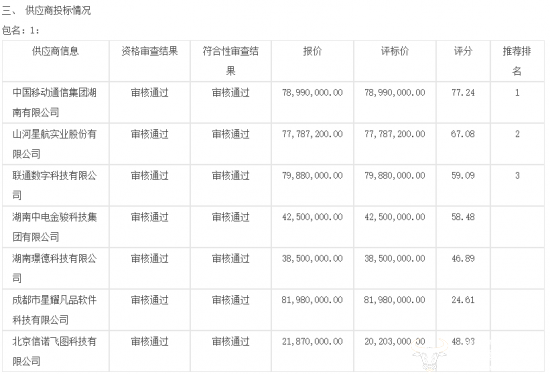 整个项目共有7家供应商投标并通过审核,其中,湖南移动以77.24分的评分结果高居推荐排名第一位,报价7899万元;排名第二的是山河星航实业股份有限公司,报价7778.72万元。其他投标企业不乏有湖南当地的科技企业、运营商旗下的专业子公司。
