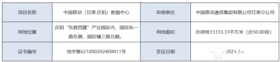 运营商财经网了解到,今年年初,中国移动(甘肃·庆阳)数据中心用地规划许可证通过审批,根据文件,甘肃移动申报的庆阳数据中心建设位于“东数西算”园区内,用地面积为33333.33平方米,合50亩。与之前公布的占地面积不同,或许这只是一期建设的用地规划。