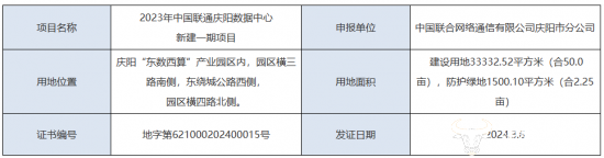 就在甘肃移动用地规划许可证公示后不久,2024年3月,中国联通庆阳数据中心新建一期项目发放用地规划许可证,同样是位于庆阳“东数西算”产业园区内,建设用地和甘肃移动庆阳数据中心面积类似,为33332.52平方米,还有防护绿地1500.1平方米。目前,该数据中心的相关内容并未公示太多。