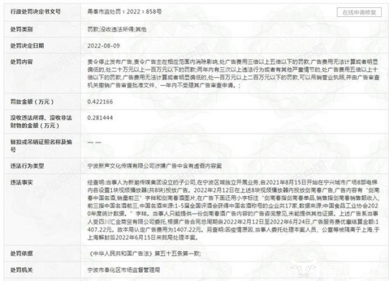 但该传媒公司只能提供一份剑南春酒广告内容的广告咨询意见,未能提供其他证据,该传媒公司涉嫌广告中含有虚假内容,被宁波市奉化区市场监督管理局责令停止发布广告,责令广告主在相应范围内消除影响,并4221.66元,没收2814.44元。