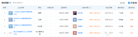 天眼查显示,他还曾在多家企业担任高管,如任深圳市格兰仕电器销售有限公司总经理、佛山市顺德区格兰仕电器配件制造有限公司董事长等,这些企业目前均已注销或吊销。