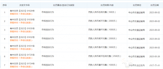 决定书文号分别为“粤中交罚【2023】01724号、粤中交罚【2023】01725号、粤中交罚【2023】01831号、粤中交罚【2023】01832号、粤中交罚【2023】01835号、粤中交罚【2023】01830号、粤中交罚【2023】01829号”,处罚事由均为市场违法行为。