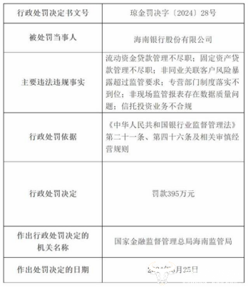 值得一提的是,海南银行395万的大罚单也是在3月底发出。金融监督管理总局海南监管局罚单显示,海南银行因存流动资金贷款管理不尽职;固定资产贷款管理不尽职;非同业关联客户风险暴露超过监管要求;专营部门制度落实不到位;非现场监管报表存在数据质量问题;信托投资业务不合规共计六项违法违规事实,被罚款395万元。不过,这个事情与张欣然无关,因为她才刚来。