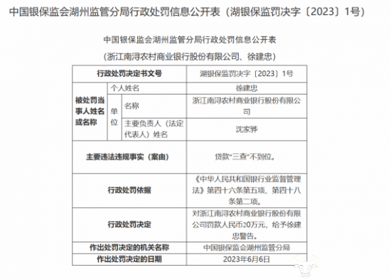 值得一提的是,2023年6月,6月8日,湖州监管分局发布的一则行政处罚信息公开表显示,南浔农商银行存在贷款“三查”不到位的违法违规事实,中国银保监会湖州监管分局依规决定对浙江南浔农村商业银行处以20万元罚款,并给予徐建忠警告。