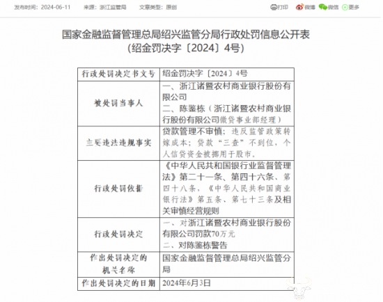 此外,值得一提的是,2024年6月11日,国家金融监督管理总局绍兴监管分局行政处罚信息公开表显示,浙江诸暨农村商业银行因贷款管理不审慎;违反监管政策转嫁成本;贷款“三查”不到位,个人信贷资金被挪用于股市,被罚款70万元;时任该行微贷事业部经理陈鉴栋被警告,作出处罚决定的日期为2024年6月3日。