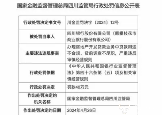 值得一提的是,除了副行长被查外,前段时间四川银行还收到了一张罚单。4月26日,该行因“办理房地产开发贷款业务中贷款用途不合规、贷前调查不尽职,严重违反审慎经营规则”被四川监管局罚款40万元。两名相关责任人对上述问题负直接经办责任,均被警告并分别罚款7万元。