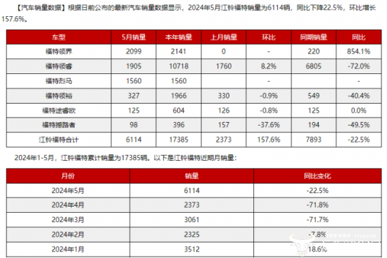 最新数据显示,5月江铃福特的销量为6114辆,同比下降22.5%,环比增长157.6%。今年1-5月份江铃福特累计销量为17385辆。