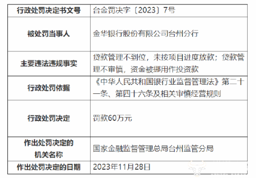 然而,值得一提的是,2023年12月,国家金融监督管理总局台州监管分局行政处罚信息公开表显示,金华银行台州分行因贷款管理不到位未按项目进度放款,贷款管理不审慎资金被挪用作投资款被罚60万元。