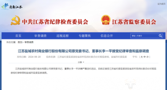 然而值得关注的是,2024年6月20日,江苏省纪委监委网站通报,江苏盐城农商银行原董事长李一平涉嫌严重违纪违法,目前正接受江苏省纪委监委派驻省农村信用社联合社纪律审查和盐城市监委调查。