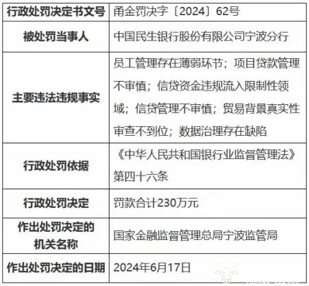 然而,值得关注的是,2024年6月21日,国家金融监督管理总局宁波监管局行政处罚信息公开表显示,中国民生银行宁波分行因员工管理存在薄弱环节;项目贷款管理不审慎;信贷资金违规流入限制性领域;信贷管理不审慎;贸易背景真实性审查不到位;数据治理存在缺陷,被罚款230万元。