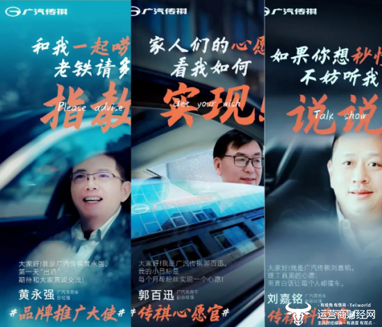 这三位领导的宣传海报上有清晰的定位,其中总经理黄永强是“品牌推广大使”、副总经理郭百迅是“传祺心愿官”、副总经理刘嘉铭是“传祺科普官”。